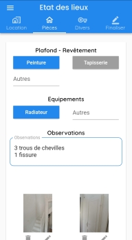 Le constat d'état des lieux se divise en différentes pièces : pour chaque pièce, la nature et l'état des revêtements sont à renseigner, avec un paragraphe destiné aux observations. Des photos sont ajoutées à l'état des lieux, directement avec la caméra du smartphone. Les photos peuvent être annotées, par exemple pour entourer une tâche ou flécher une rayure.